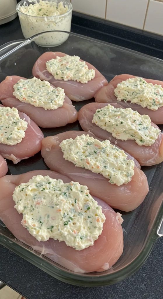 4. Evenly spread the cheese mixture over the top of the chicken, and sprinkle with remaining Parmesan.