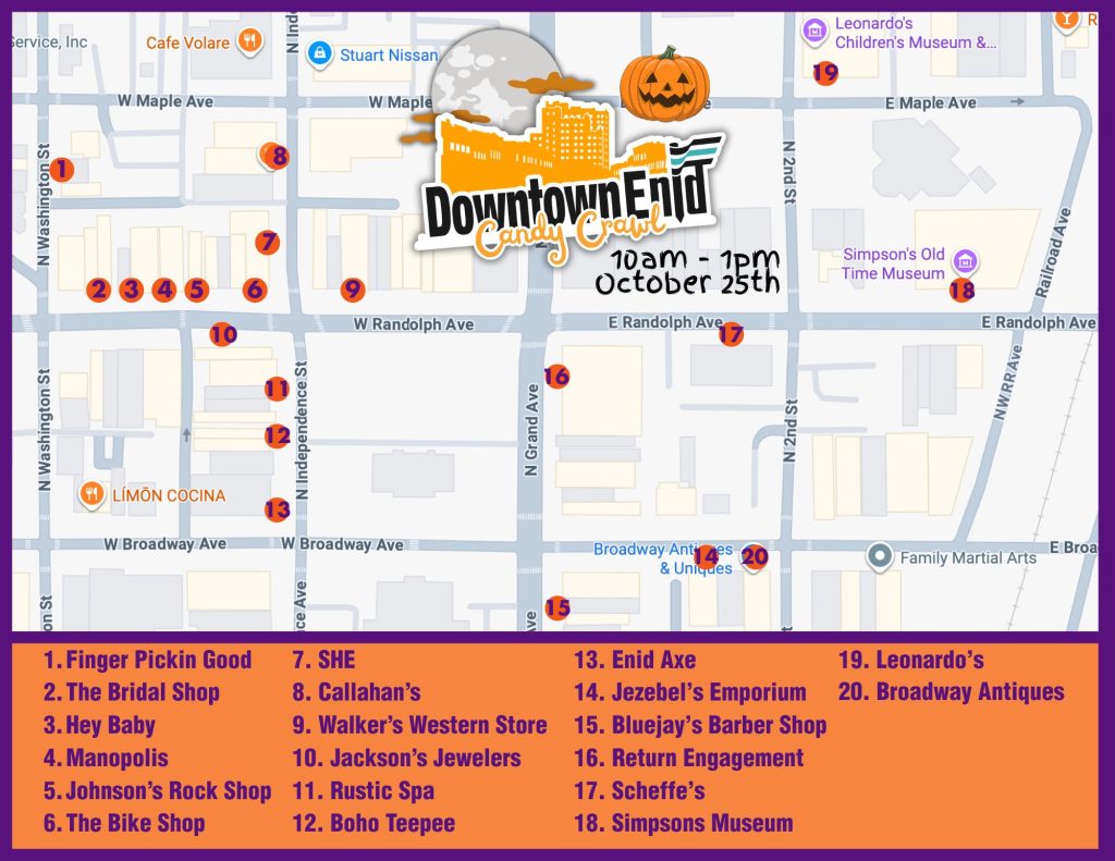 To find participating locations, look for the Candy Crawl flyer and map in store windows. A digital map will also be shared on the Main Street Enid Facebook page before the event.